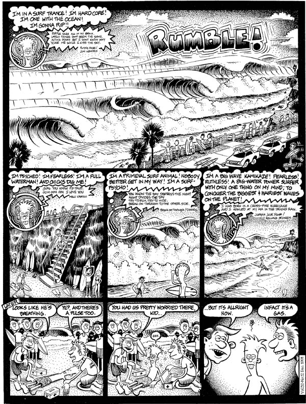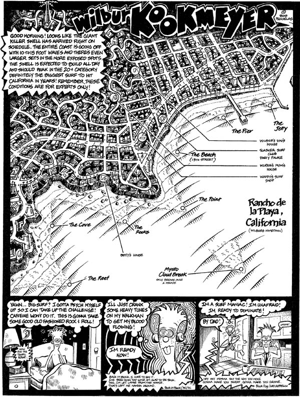 Wilbur Kookmeyer comic strip by Bob Penuelas showing Wilbur performing various surf maneuvers with captions like "He Rips," "He Tears," and "He Shralps."
